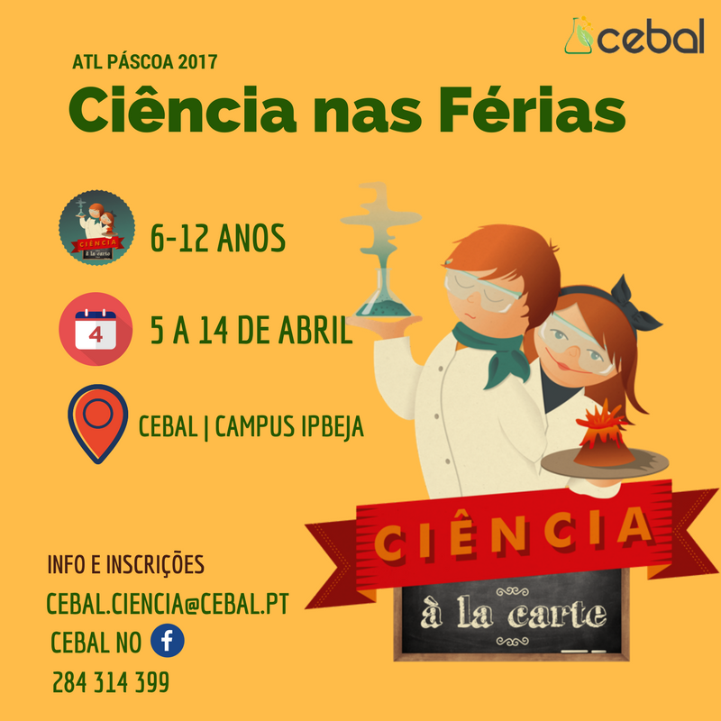 O CEBAL (Centro de Biotecnologia Agrícola e Agro-Alimentar do Alentejo) volta a oferecer animação científica nas Férias dos mais novos. De 5 a 13 de abril, o projeto «Ciência à la Carte» serve o ATL da Páscoa 2017 para cientistas dos 6 aos 12 anos, com muitas atividades científicas e diversão garantida. No laboratório do CEBAL vamos fazer experiências para aprender sobre o corpo humano, o ar ou a água, ver o ADN e fazer explosões de cores, construir termómetros e cataventos, estudar a cor das plantas e usar a ciência numa investigação criminal. Nesta edição do ATL «Ciência à la Carte» haverá ainda um dia especial intergeracional: a cozinha transforma-se num laboratório cheio de experiências deliciosas para avós e netos.